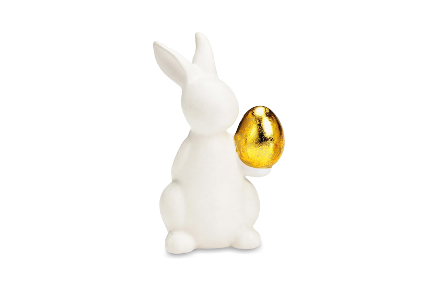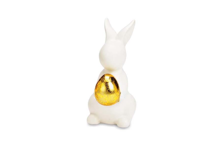White ceramic rabbit figurine with gold Easter egg