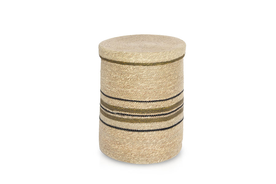 Seagrass basket with green stripes and lid D37cm H46cm