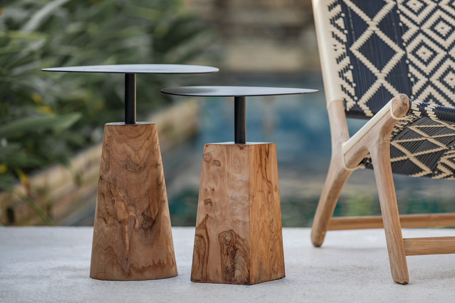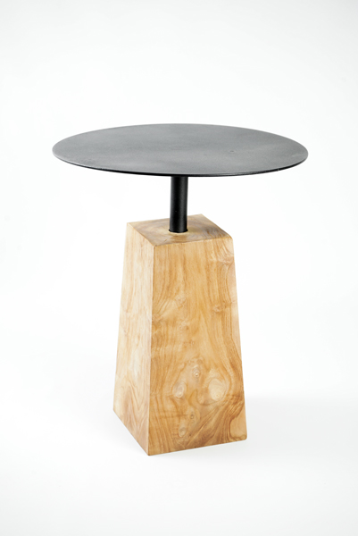 Side table with black metal top and teak base