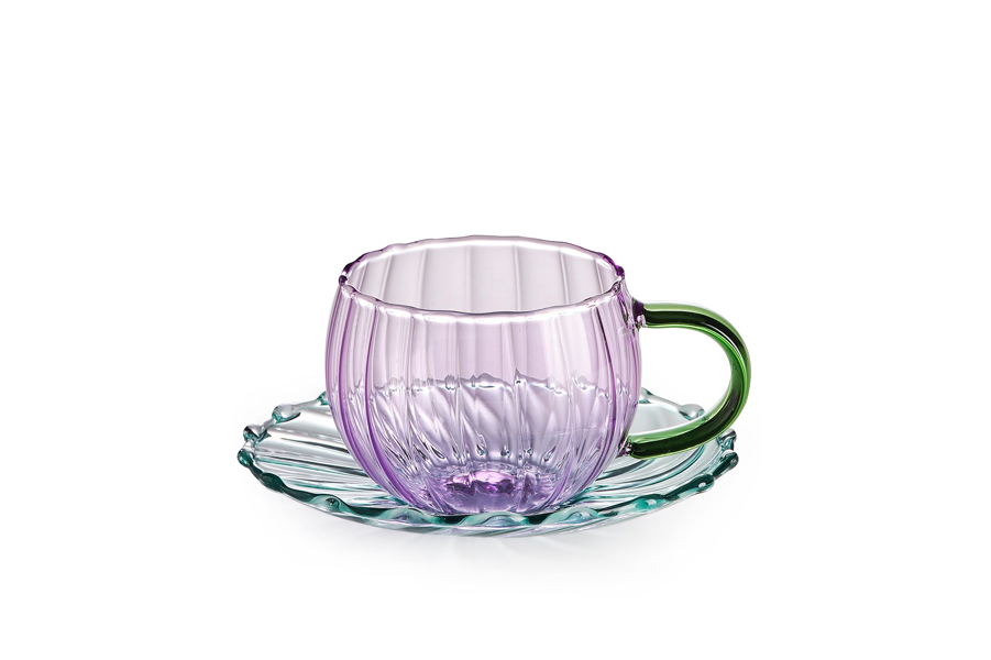Set of 2 lilac glass coffee cups with saucer and green handle
