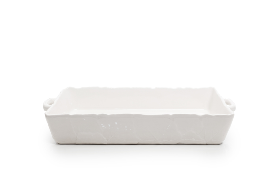 White ceramic baking dish with handles and vine leaves design