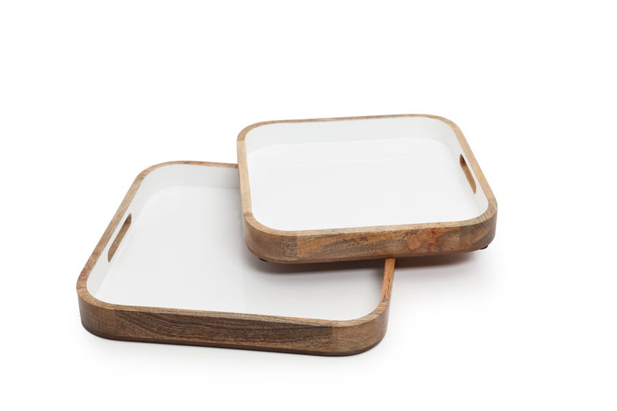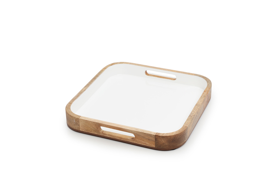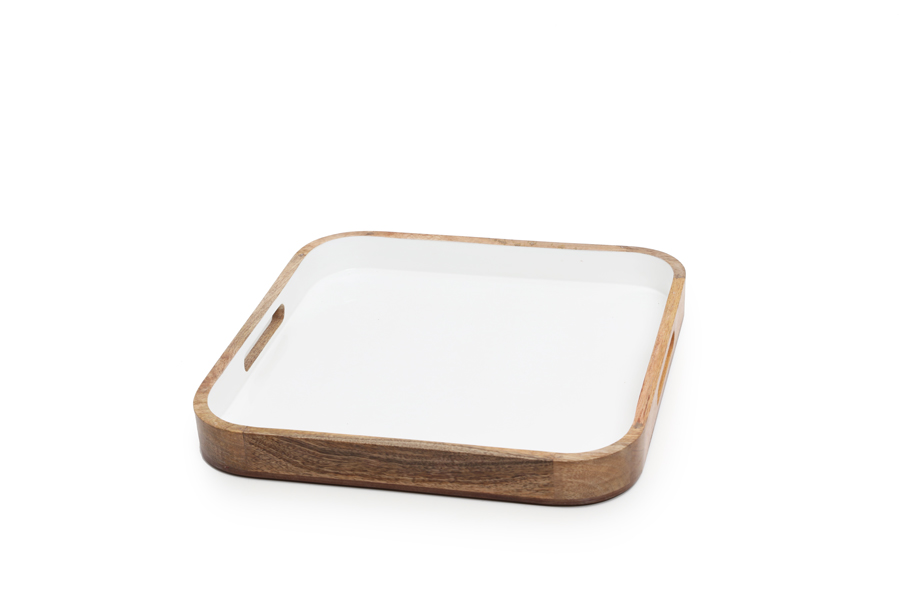 White enameled mango wood tray with handles