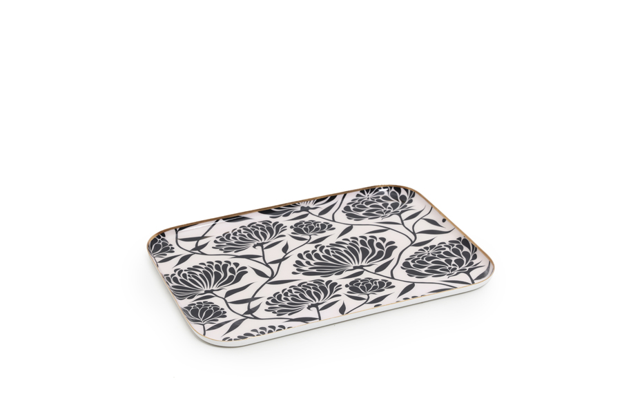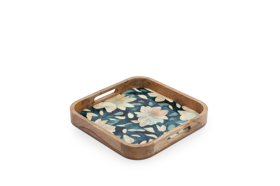 Enameled mango wood tray with blue flowers design